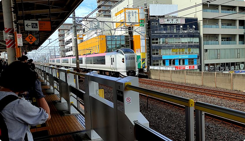 写真は本八幡駅を通過する,下りの成田エクスプレスです。