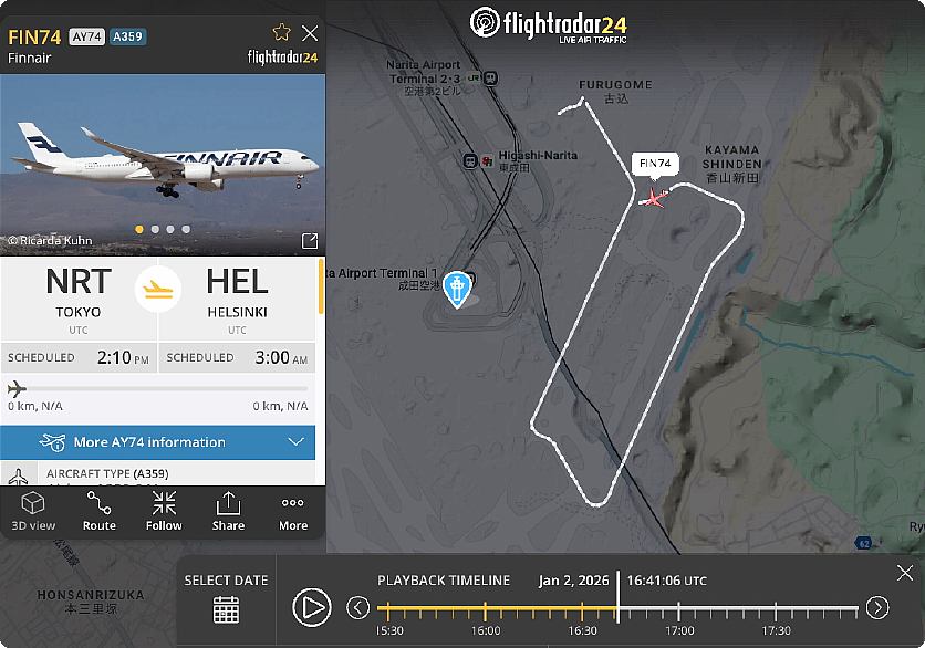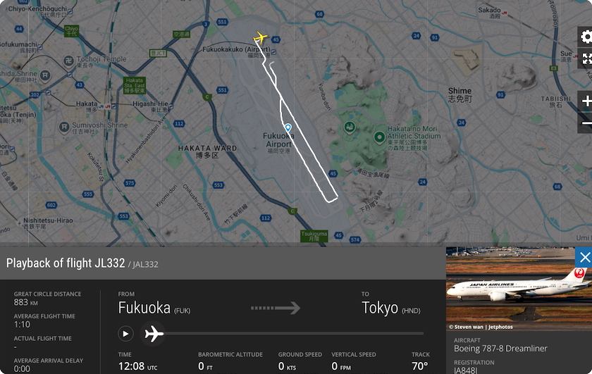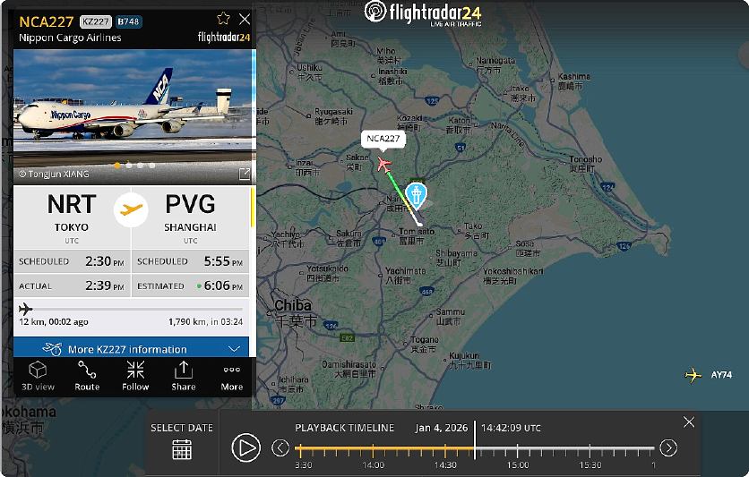 下図は「Flightradar24」による同機の航跡ですが、昨日のエアジャパン機とほぼ同じ飛行コースを取っています。
