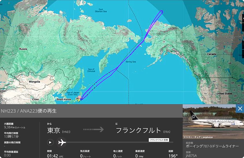 @フランクフルト行きの全日空機が14時間かけて羽田空港に引き返す 昨日の「ニュースダイジェスト」などによりますと、昨日午後、羽田発フランクフルト行きの全日空223便・ B787-9 型機が、ベーリング海峡を過ぎたアラスカ沖を飛行中に、「エンジンオイルの量が不足している」との警告灯がでました。 フランクフルトには整備する体制がないため、同機は羽田空港に引き返し無事着陸しました。 同機には乗客・乗員164人が乗っていましたが,出発から羽田空港着陸までは約14時間かかったとのことです。 同機は整備に時間がかかるため、代替機で6時間後にフランクフルトに向かいました。 【コメント】大変でしたね。日本からフランクフルトまでは12時間以上かかりますので、飛行機に乗っているだけで26時間というこことになります。 下図は「Flightradar24」による、引き返しの航跡図です。
