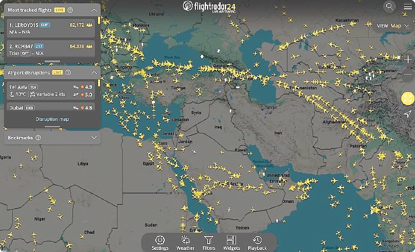 @米国・イスラエルとイランの衝突で、成田空港から中東に向かう4便が欠航に 米軍・イスラエルとイラクとの武力衝突で、今日の成田発ドーハ行きのカタール航空809便と807便、成田発アブダビ行きのエティハド航空801便、成田発ドバイ行きのエミレーツ航空319便は、いずれも欠航となっています。 【コメント】この衝突が長引くと、我々の生活に大きな影響が出てきそうですね。イランがホルムズ海峡の封鎖を行うと、原油や天然ガスを積んだタンカーの通過が出来なくなります。 そうなるとガソリンや航空燃料のケロシンが不足し、ガソリンが値上げされます。ガス代も値上げになると考えられます。旅行代金も値上げになります。 下図は今日の午前中に切り取った中東空域の様子です。ものの見事にイランの空域をさけています。