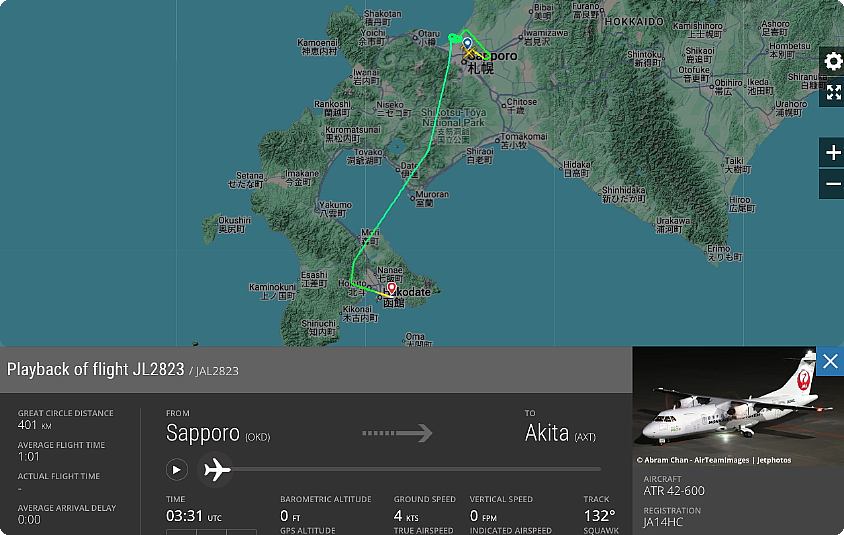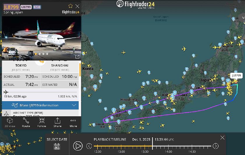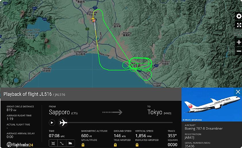 下図は「Flightradar24」による同機の航跡ですが、便名が何故か「JL 8799」便となっています。