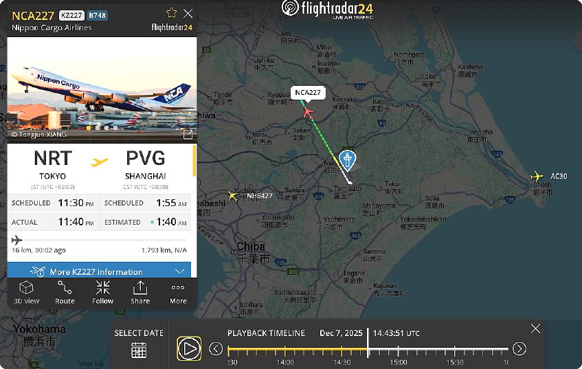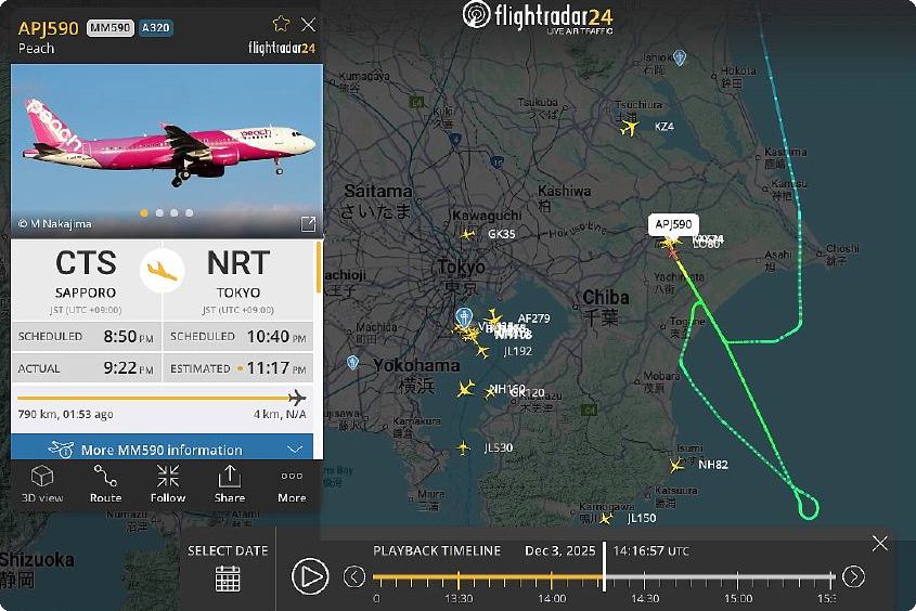 下段の「昨夜午後11時00分以降の離着陸」にもありますが、昨日午後11時17分に成田空港に到着したピーチ・アビエーション590便が、九十九里海岸を通過したところで、急遽着陸を断念し、西側に旋回して、太平洋上に出て、着陸をやり直しました。