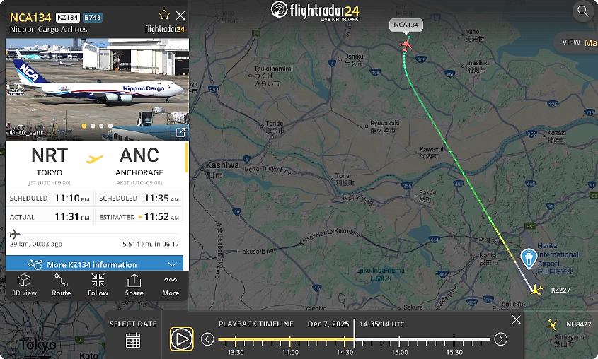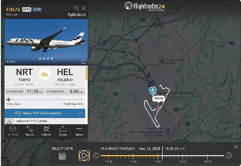 今日、下段にある「昨夜午後11時00分以降の離着陸」を調べていたところ、フィンランド航空74便が北離陸のためにA滑走路南端に来たところで、離陸できず駐機スポットに引き返しました。